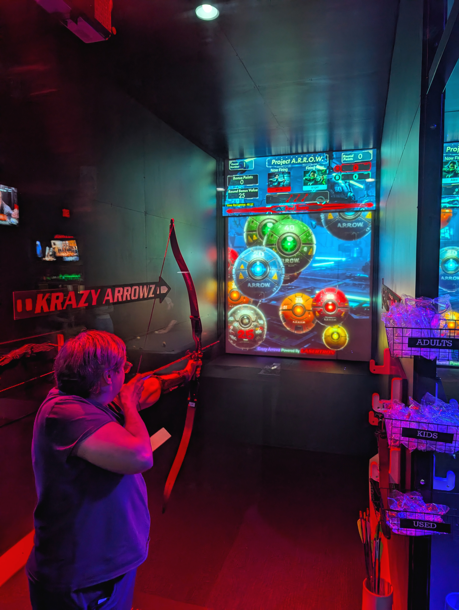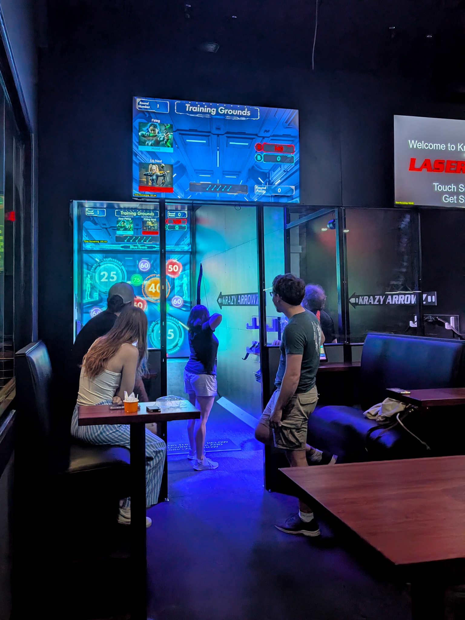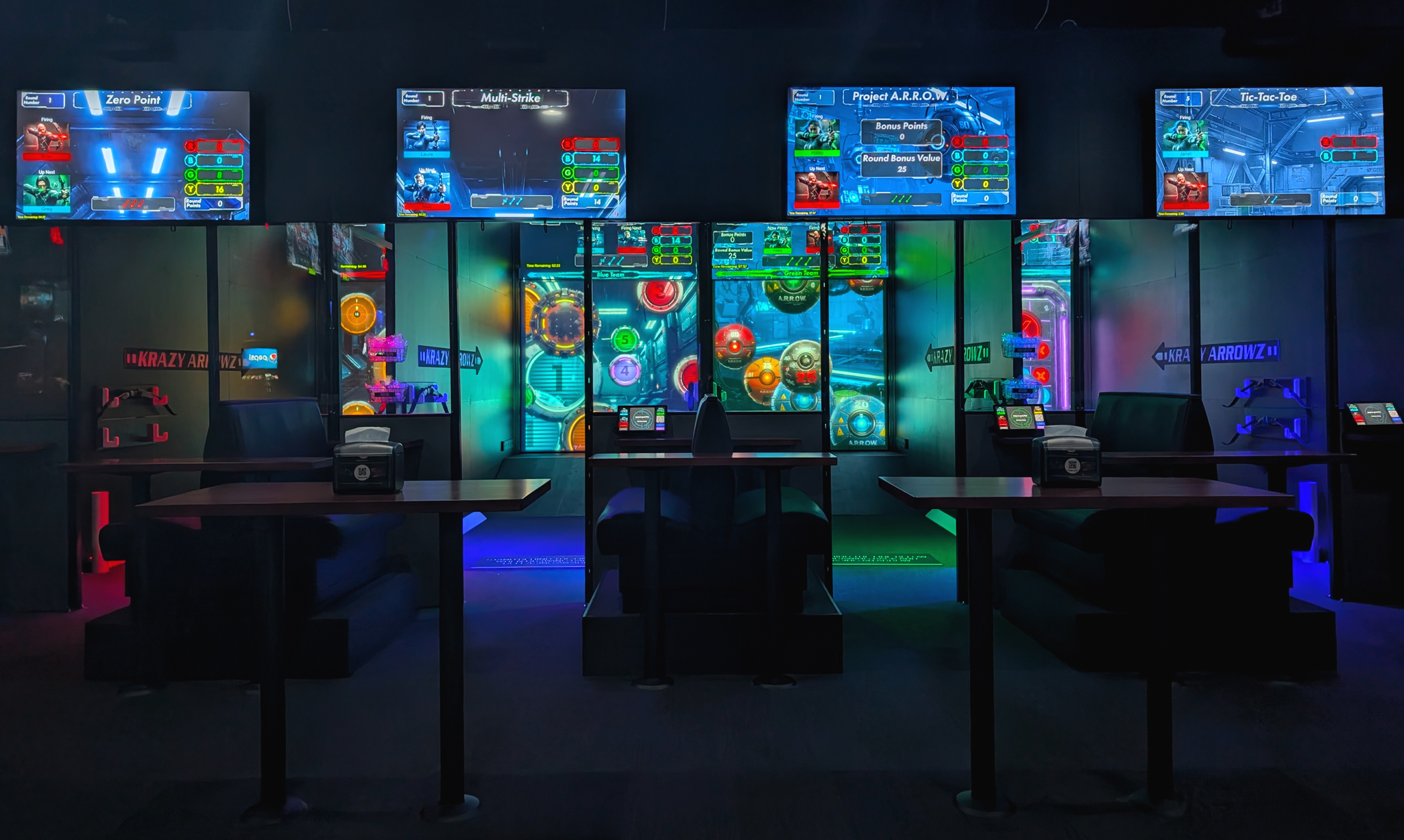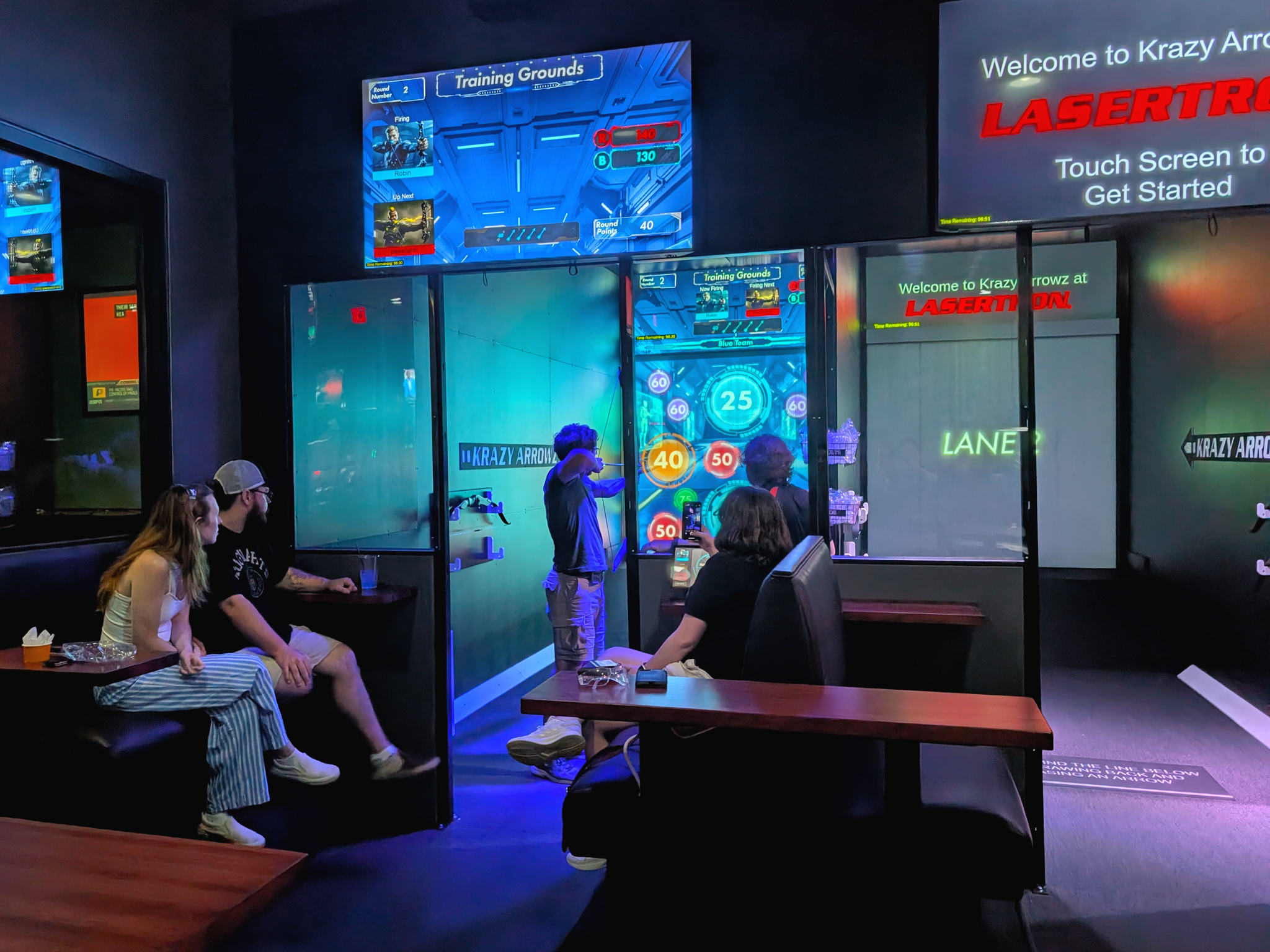 This groundbreaking attraction fuses live archery with fast-paced digital gameplay. Using real arrows, players will fire at a massive interactive screen loaded with games that test precision, speed, and strategy. From competitive team battles to trivia challenges, Krazy Arrowz delivers the thrill of real archery in a safe, high-tech environment. Whether you're a first-timer or a seasoned marksman, it's time to aim, fire, and go Krazy, only at LASERTRON.